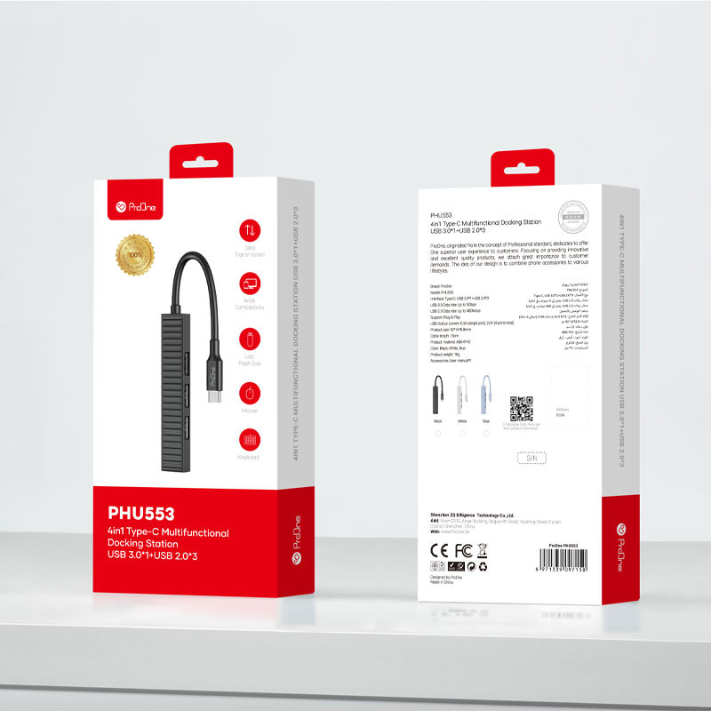 هاب 4 پورت تایپ سی پرووان مدل PHU553 با بسته بندی محکم و خوب عرضه میشود که از محصول در برابر ضربه و آسیبهای احتمالی در طول حمل و نقل محافظت میکند. طول کابل این هاب 15 سانتیمتر است که برای اتصال به اکثر دستگاهها کافی است. جنس بدنه این هاب از ABS و PVC است که علاوه بر مقاومت بالا، در برابر خط و خش نیز مقاوم است. هاب 4 پورت تایپ سی پرووان مدل PHU553 با ابعاد 92*16*8.8 میلیمتر، یکی از هابهای کوچک و جمع و جور موجود در بازار است که به راحتی میتوانید آن را در جیب یا کیف خود حمل کنید. وزن این هاب نیز بسیار سبک است و به سختی آن را در دست یا روی میز خود احساس خواهید کرد. علاوه بر این موارد، هاب 4 پورت تایپ سی پرووان مدل PHU553 از رنگ مشکی و سفید جذاب و شیکی برخوردار است که به زیبایی هر چه تمامتر با میز کار شما هماهنگ میشود. در مجموع، هاب 4 پورت تایپ سی پرووان مدل PHU553 از نظر بسته بندی، مشخصات ظاهری و کیفیت ساخت در سطح بالایی قرار دارد و میتواند انتخابی ایدهآل برای کاربرانی باشد که به دنبال یک هاب باکیفیت و خوشساخت هستند.